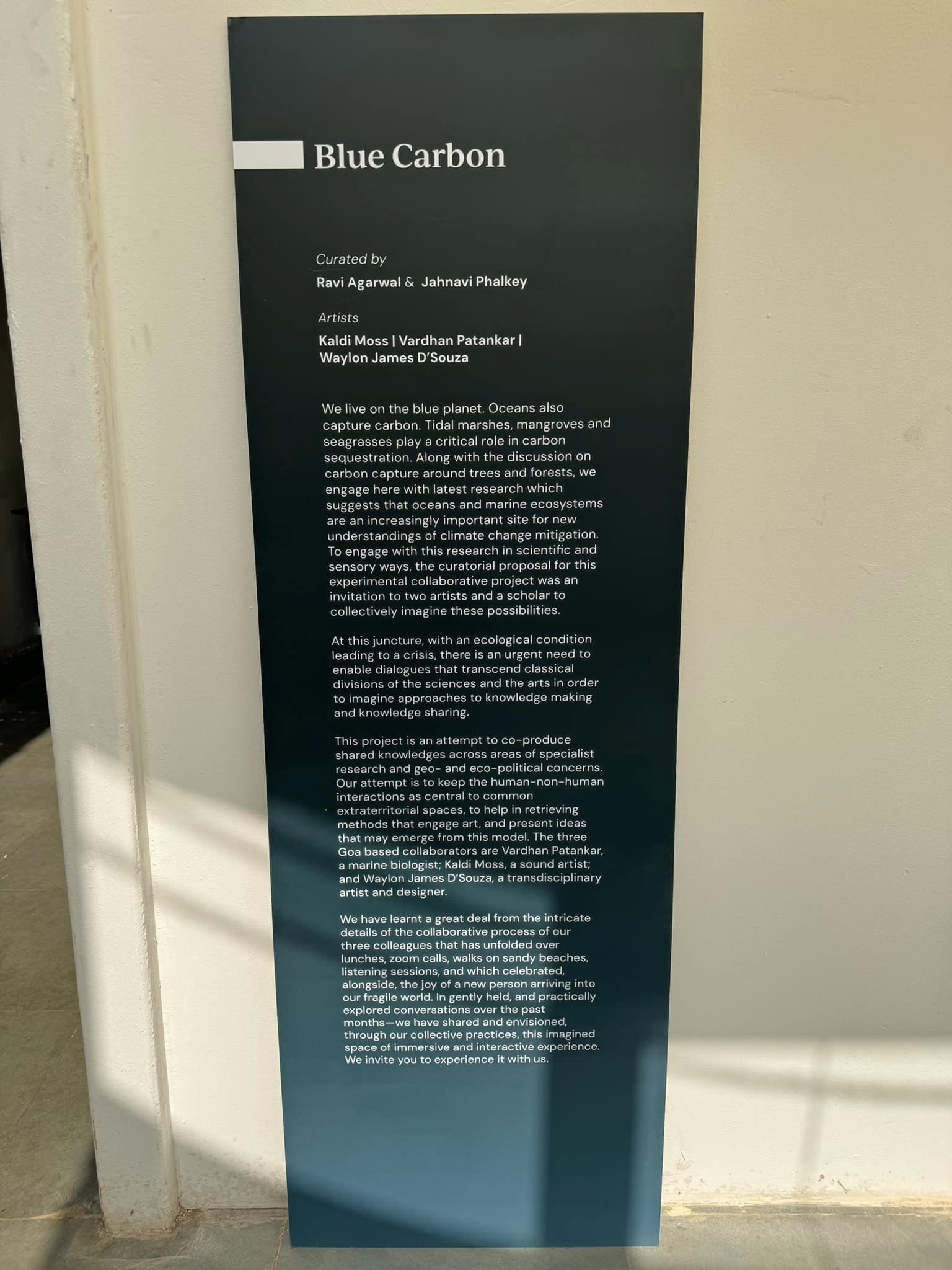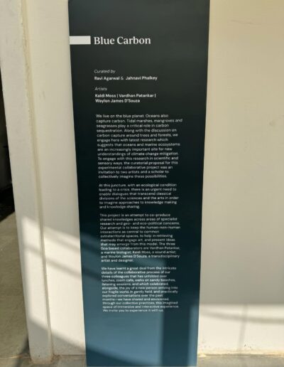 We live on the blue planet, and all this water continually captures carbon. Moving away from the discussion on carbon capture through trees and forests, this exhibition seeks to open our minds to the latest research that points to the ways in which oceans and marine ecosystems are an increasingly important site to explore innovative climate change mitigation. Tidal marshes, mangroves and seagrasses play a critical role in carbon sequestration. To bring this new research into the public domain, a collaboration has been facilitated between artists and scholars based in Goa to create an exciting exhibit and programme that brings the sea home in a new way.